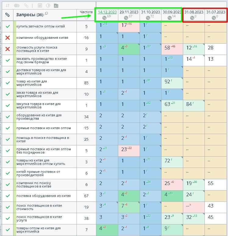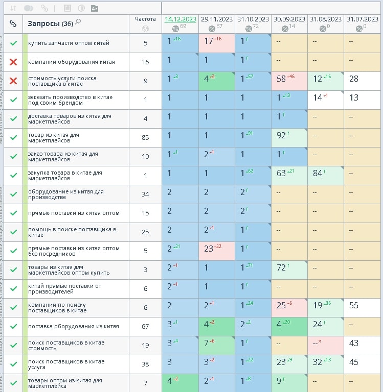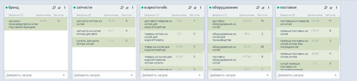 1. Сбор запросов по темам: поиск поставщиков в Китае, запчасти из Китая, товары из Китая для маркетплейсов, оборудование из Китая и производство под своим брендом в Китае. Семантическое ядро собиралось, чтобы выстроить четкую структуру для нового сайта: