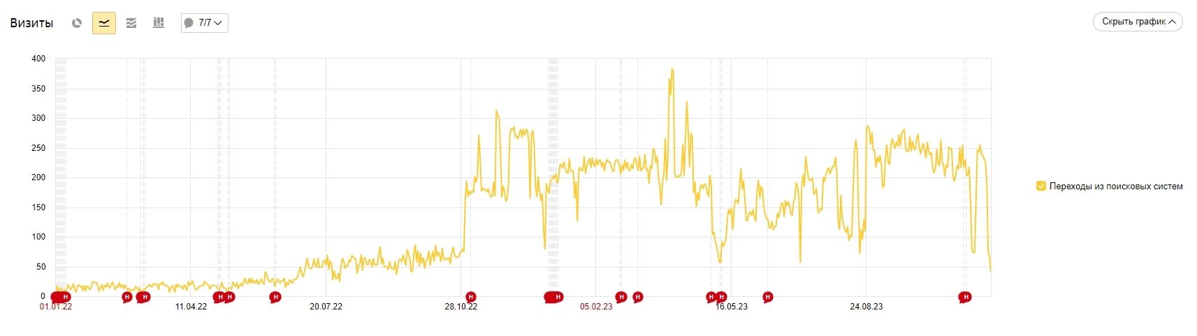 1. Переходы из поисковых систем с начала продвижения увеличилось из 10 до 200.