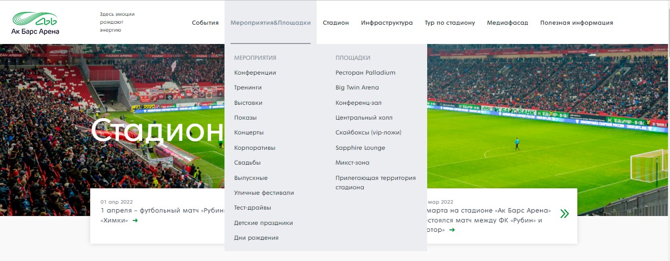 Также на сайте реализован раздел про историю стадиона, видео и фото с самых ярких событий, инфраструктура, навигация и многое другое.